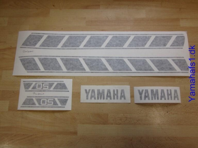 Stafferingsæt årg 76, til sideskjolde & tank. sort yamahaskrift på tank bruges på Gul & sølvgrå